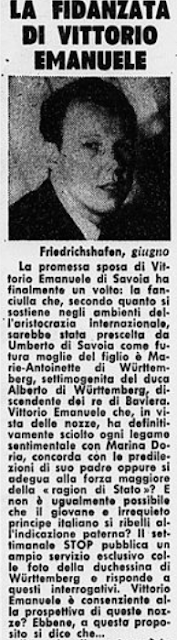 “The promised wife of Vittorio Emanuele of Savoy finally has a face: the girl who, according to what is claimed in the circles of the international aristocracy, would be chosen by King Umberto as the future wife of his son is Marie-Antoinette of Württemberg, the seventh child of Duke Albrecht of Württemberg. Vittorio Emanuele, in view of this impending marital alliance, has definitively dissolved any sentimental relationship with Marina Dorina, agrees with his father’s predilections or adheres to the arrangement for ‘raisons d’État’?”